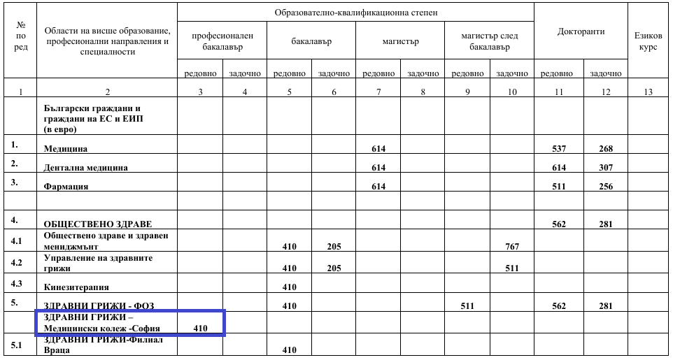 *Семестриалните такси за всички специалности в  Медицински колеж – София са към направление Здравни грижи – I, II, III курс. Таксите посочени в таблицата са за цяла учебна година. – 410 €